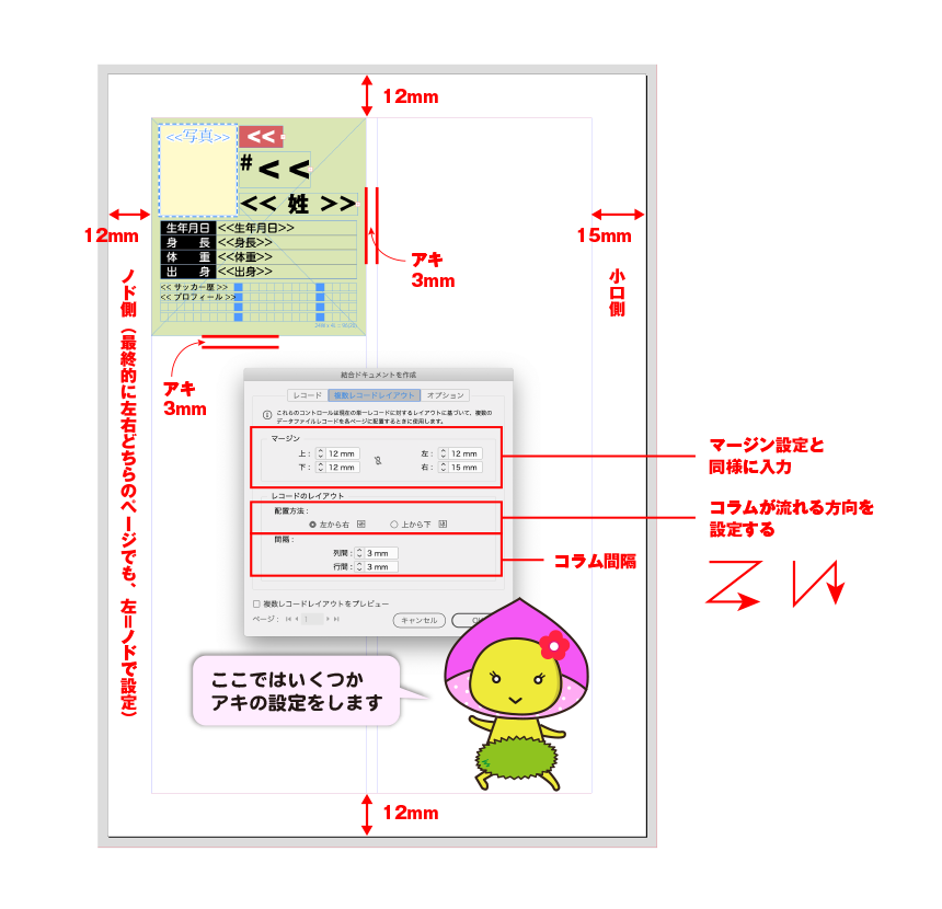 データ結合パレットの「結合ドキュメントを作成」ボタンを押すと、設定画面が開くので、必要な設定をいれていきます。