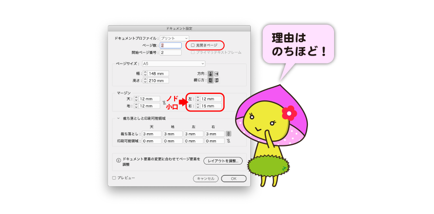 この時、ドキュメント設定で、見開きのチェックは外しておきます。