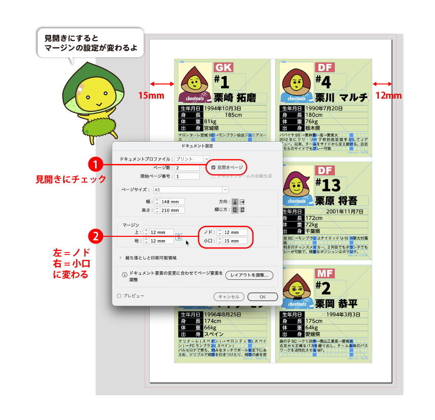 ドキュメント設定で見開きにチェックを入れます。