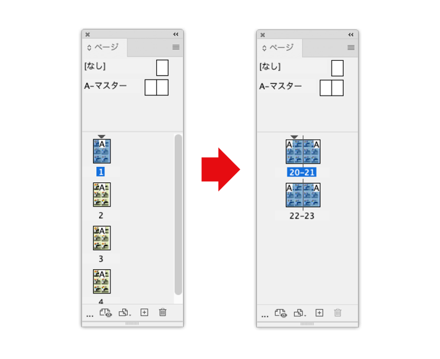 データ結合でページを作成すると、見開きのドキュメントでも単ページで作成されます。見開きドキュメントの場合、このあとページを見開きにします。