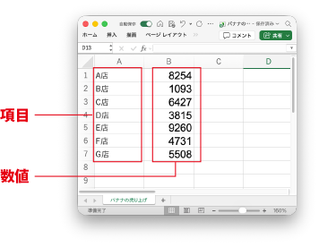 これは棒グラフに限らず、グラフを作成するにあたってはエクセルなどの表計算ソフトにデータを入力してもらったものを支給してもらいます。