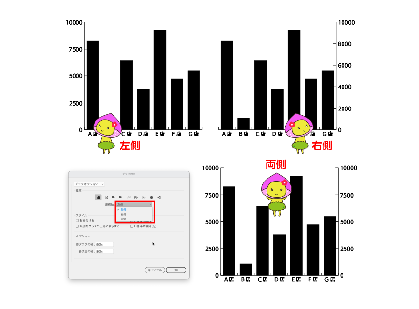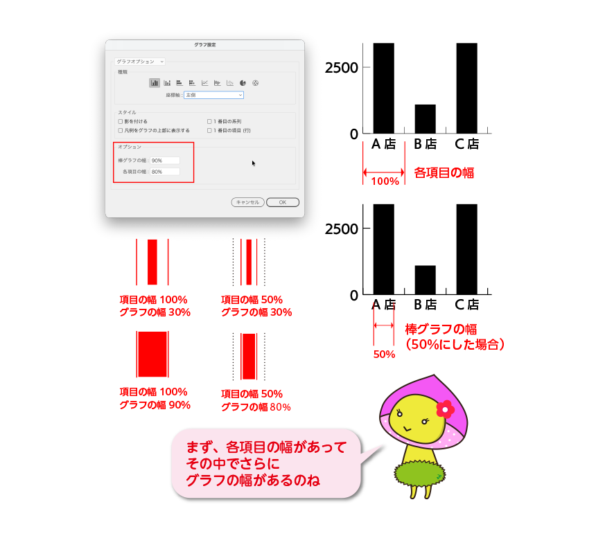 ▪ オプション>「棒グラフの幅」と「各項目の幅」