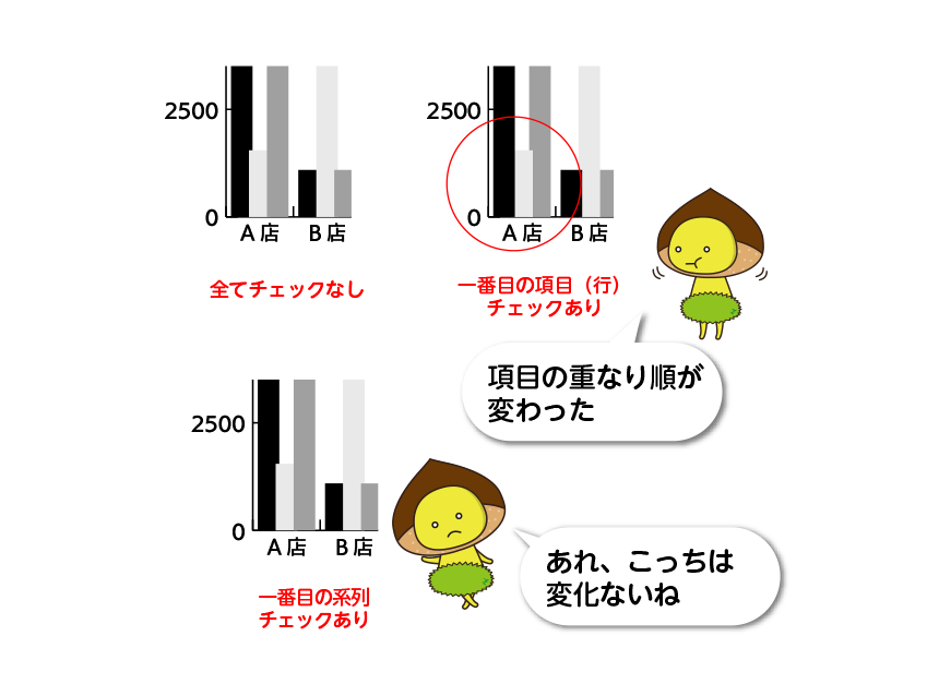 それぞれの棒グラフが重なりあうようなデザインはあまりないかもしれませんが、試しにやってみると、チェックを入れた場合と入れない場合ではグラフ同士の重なり順が変わります。