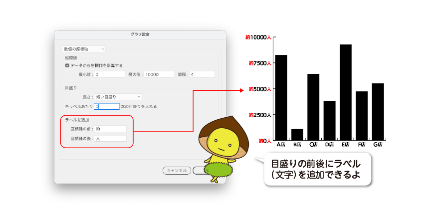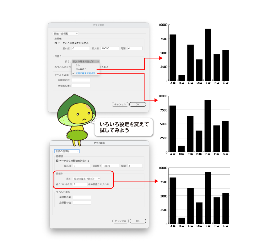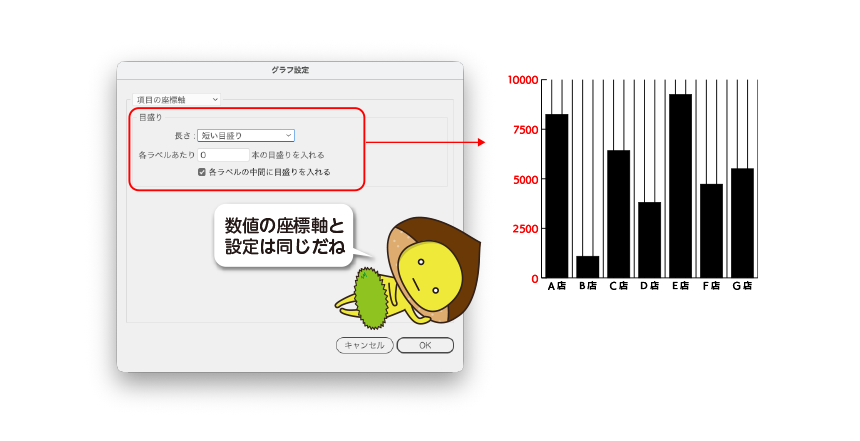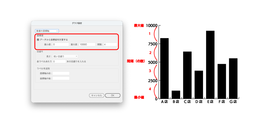 データの数値データをもとに座標の目盛を作る事ができます。またはデータに関係なく独自のメモリも振る事ができます。間隔数を入力する事で、自動的に中間の座標値も作成されます。