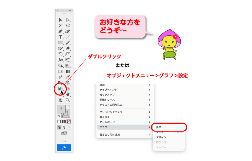 グラフのデータは、Illustratorのグラフツールを開いて、そこから入力するようになっていますが、おそらく案件の多くは、クライアントや編集者からデータの提供をしてもらう事になるはずです。