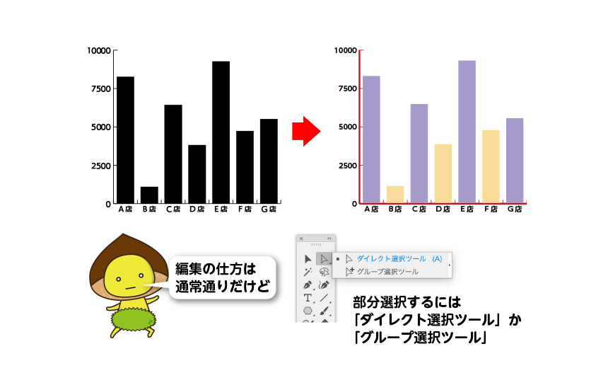 サイズなどが整ったら、文字の書体、サイズやグラフの色を変更するなどして、デザインを仕上げます。グラフは全体がグループ化されているので、「ダイレクト選択ツール」か「グループ選択ツール」を使います。