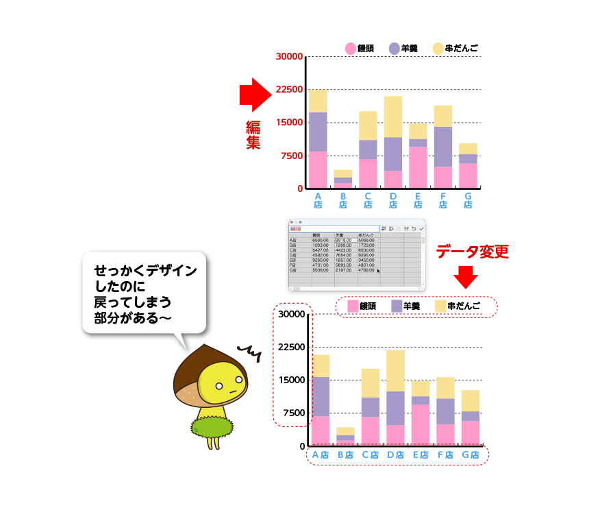 データの変更が予想される場合は、再度デザイン設定をしなければならなくなるので、変更が入った場合は必ず元のグラフをコピーして保存しておき、スポイトツールなどで修復するか、スタイルシート等を作成しておき、再適用することで、ある程度修正の手数が少なくなります。
