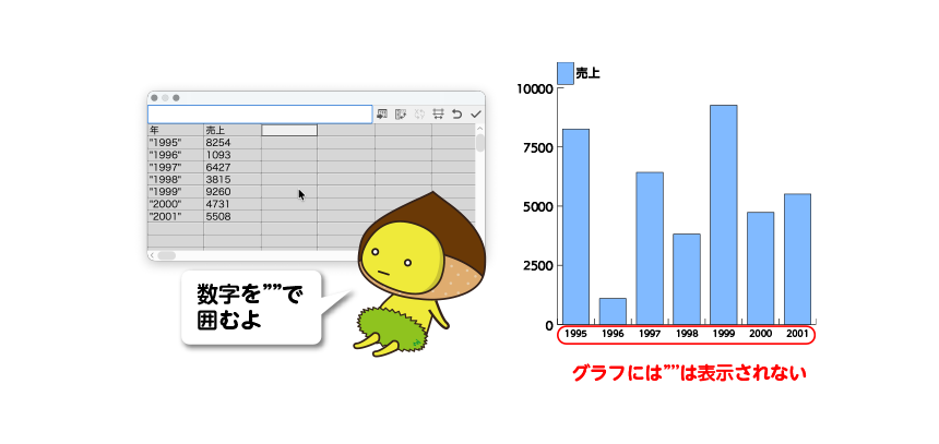●または、入力時に、半角のダブルクォテーションで挟むと、数字と判断されず、項目として表示されます。(グラフには表示されません)